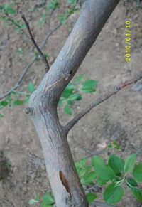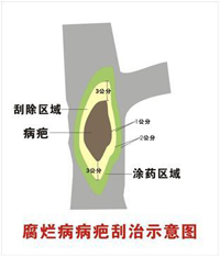 2.病疤治療是目前防治此病的有效方法?稍谕砬锖驮绱汗沃尾“坛仕笮瘟⒉,后涂藥促進愈傷組織生長,或用劃道法治療病疤。劃道法是劃病部成0.5厘米寬的縱道,再用甲基硫菌靈等殺菌劑或愈傷涂膜劑涂抹。