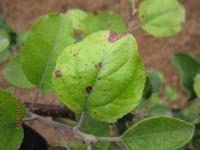 主要為害葉片,也為害嫩枝和果實。發(fā)病初期,葉片上出現(xiàn)褐色或深褐色小點,后擴大為直徑5-6毫米的病斑,周圍有紫紅色暈圈,邊緣清晰。天氣潮濕時,病斑上長出黑色霉層。幼葉被害,有時葉片呈畸形。為害嚴重時,被害葉干枯,提早脫落。果實被害,上生近似葉片上的斑點。枝條被害,也生褐色微凹陷的病斑,病斑周圍常產(chǎn)生裂紋。