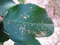 蘋果綿蚜一年發(fā)生8—9代,主要以一齡和少數(shù)二齡若蟲在樹體上群聚越冬。越冬的部位大多在中、下部的主枝和大枝上。在枝干上有愈傷組織、剪鋸口、皮隙縫等處或在根瘤上群集。越冬的成活率隨越冬群體的大小而不同,群體越大,成活率越高。來年春季,在4月初開始為害。5月上、中旬為田間蔓延階段,6月—7月中旬是該蟲大量繁殖,蔓延、擴散的重要時期,往往綿狀物累累全樹,造成嚴重為害。因此5月份蟲群尚未擴散是防治的關鍵時期。7月下旬—8月中旬蟲口數(shù)量迅速下降,其原因是高溫和寄生蜂的原故。