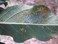病菌在檜柏上為害小枝,即以茵絲體在菌癭中越冬。第二年春天形成褐色的冬孢子角。冬孢子柄被有膠質,遇降雨或空氣極潮濕的胺化膨大,冬孢子萌發(fā)產(chǎn)生大量擔孢子,隨風傳播到蘋果樹上。銹菌侵染蘋果樹葉片、葉柄、果實及當年新梢等,發(fā)病期持續(xù)一個月。