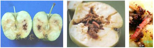 被害果果面有針頭大小的蛀(入)果孔,由孔流出淚珠狀汁液,干涸后呈白色蠟狀物。幼蟲取食果肉形成彎曲縱橫的蟲道,蟲糞留在果內呈“豆沙餡”狀。幼果被害后,生長發(fā)育不良,形成凹凸不平的“猴頭果”;后期受害的果實,果形變化不大;被害果大多有圓形幼蟲脫果孔,孔口常有少量蟲糞,由絲粘連。