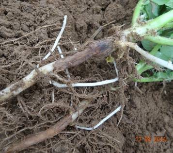 黑痣病又稱(chēng)立枯絲核菌病、莖基腐病、絲核菌潰瘍病、黑色粗皮病,是以帶病種薯和土壤傳播的病害。莖上發(fā)病首先在近地面處產(chǎn)生紅褐色長(zhǎng)形病斑,后逐漸擴(kuò)大,莖基部周?chē)兒诙砥じ癄。因輸導(dǎo)組織被破壞,葉片逐漸枯黃卷曲,植株易傾斜倒伏死亡。地下塊莖發(fā)病多以芽眼為中心,生成褐色病斑,其后干腐或瘡痂狀龜裂,薯塊小而不光滑。溫度低濕度大時(shí),病株表面著生白色霉?fàn)钗,造成部分死亡?/span>
