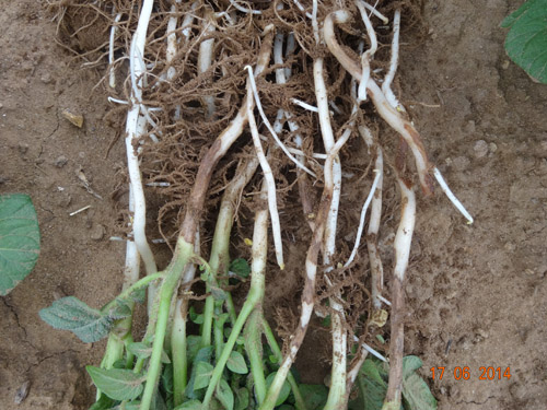 試驗(yàn)背景:隨著馬鈴薯面積的擴(kuò)大,連作障礙土傳性病害越來(lái)越嚴(yán)重,特別是像黑痣病、枯萎病近2年發(fā)生特別嚴(yán)重,而且治療非常困難。市面上防治這類(lèi)病害的藥劑效果好的很少。2014年由于前期地溫比較低、濕度大,黑痣病感染比較嚴(yán)重,有的甚至已經(jīng)感染匍匐莖,嚴(yán)重影響到馬鈴薯的生長(zhǎng)。