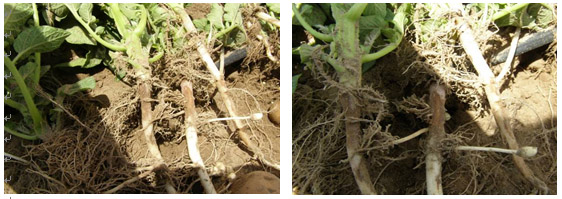 此馬鈴薯地塊由于受黑痣病的影響出苗不齊,苗長(zhǎng)勢(shì)較差,特別是幼苗感染黑痣病較多,嚴(yán)重的地方出現(xiàn)莖基部腐爛、斷裂。